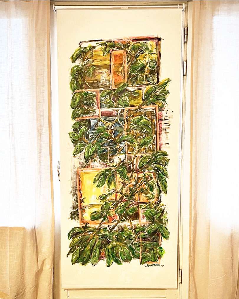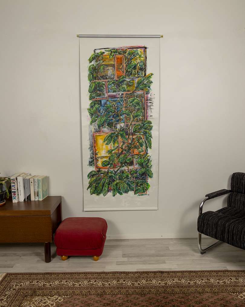 Minulla on parveke, parvekkeessa on luonnollisesti ovi ja siinä on ikkuna. Tämä teos sopi loistavasti juuri siihen. Halusin maalata jotain sekä geometristä, että vapaasti virtaavaa. Loin taakse muutamia neliöitä rajaamaan teosta, päälle maalasin luontoelementtejä. Tästä teoksesta on saatavilla myös taidekortteja! Kasviparvi on maalaus joka sopii parvekkeen oveen tai kapeaan ikkunaan. Värikäs, geometrinen ja luonnonläheinen maalaus tuo luonnon lähelle.Tämäkin teos on maalattu rullaverhoon, kokonsa puolesta se sopii parvekkeen oveen, tai kapeaan ikkunaan. Mihin sinä ripustat sen?