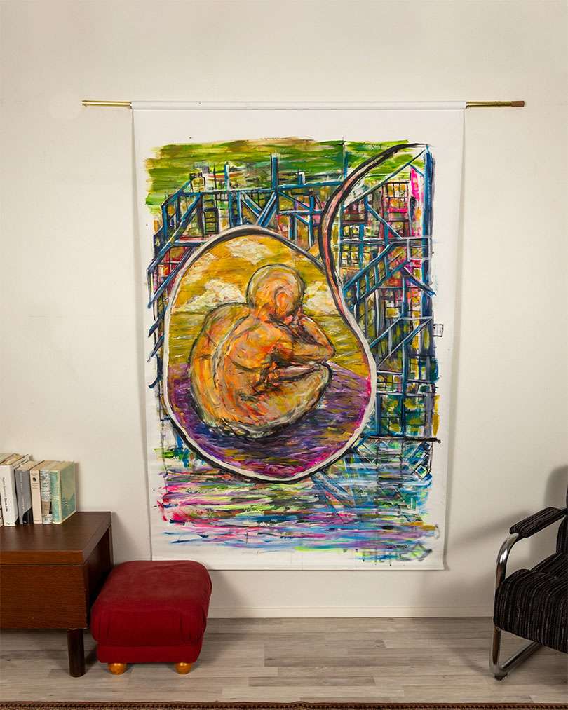 Tämän pohjalla on muistaakseni toinen maalaamani rullaverho. En ollut alunperin tyytyväinen teokseen, joten se päätyi noin puoleksi vuodeksi kaapin pohjalle odottamaan parempaa inspiraatiota. Kun se parempi inspiraatio saapui, maalasin kokonaan vanhan teoksen päälle. En ole varma, missä vaiheessa teoksen muodot alkoivat ilmestymään, mutta pian huomasin mystisen hahmon istuvan kuplan sisällä jossain, ehkä toisessa ulottuvuudessa tajuntansa uumenissa?Janneblancon pimentävillä rullaverhoilla saat uuden ulottuvuuden ainutlaatuiseen kotiin.