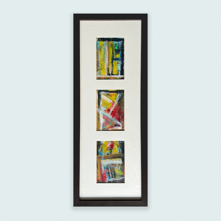 Kolmiosainen, pitkä taideteos on maalattu rullaverhokankaaseen ja kehystetty kierrätyskehyksellä.
